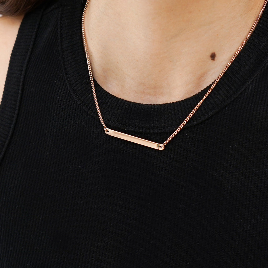 Timeless essentials for a gift to yourself or your loved ones. A classic bar set in the middle of a curb chain for a well balanced look suitable for everyday wear.